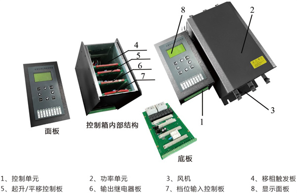 GVDJ控制器由控制單元和功率單元組成,兩者固定為一體。電氣連接方式通過矩形插座連線連接,控制單元由升降控制板(GV-002DI)/(平移控制板GV-003DI)、輸岀板(GV-004DI、GV-008DI)、檔位輸入控制板(GV-009DI)、移相觸發(fā)板GV-005DI)、顯示板(GV-015DI)及案板(GV-006DI)組成。功率單元由晶閘管、散熱器、壓敏電阻、阻容保護模塊、溫度繼電器及風(fēng)扇組成。整體結(jié)構(gòu)如下圖所示: