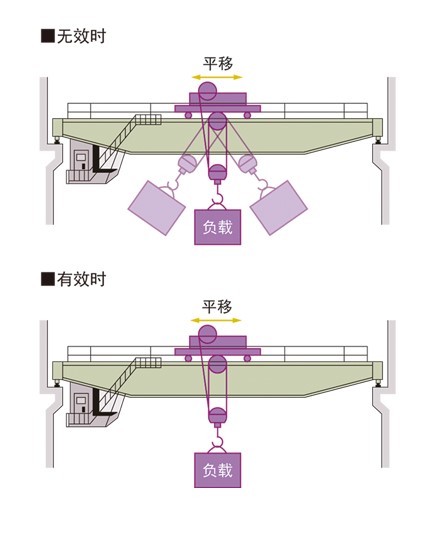 內(nèi)置了防搖擺功能, 可抑制平移時貨物的晃動。 由于負(fù)載不會晃動, 可更快地放下,因此有利于縮短運(yùn)行周期。