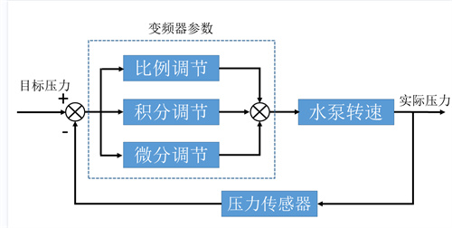 實際壓力是靠壓力傳感器,或者遠(yuǎn)傳壓力表檢測出來,再告訴變頻器的。變頻器收到實際壓力的數(shù)據(jù)后,再和目標(biāo)壓力進行比對,如果實際壓力比目標(biāo)壓力要小,在變頻器內(nèi)部,經(jīng)過PID運算后,就會輸出一個遞增的頻率值,這個頻率值就是對應(yīng)水泵轉(zhuǎn)速的,這時,水泵轉(zhuǎn)速就升高,管道中的實際壓力也就會隨著增大。