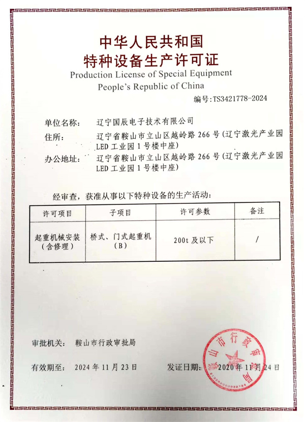 遼寧國辰電子技術有限公司產(chǎn)品許可證書